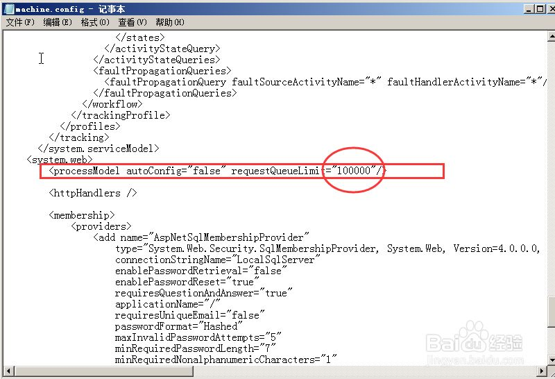 3. 调整machine.config中的processModel>requestQueueLimit的设置