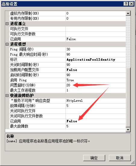 [2] Process Model->Idle Time-out设置为0(不让应用程序池因为没有请求而回收)