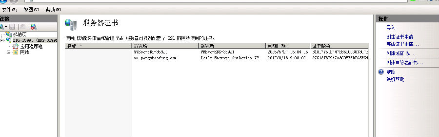 7.然后在IIS中选择服务器证书,完成证书申请,选择证书文件输入密码,添加成功。