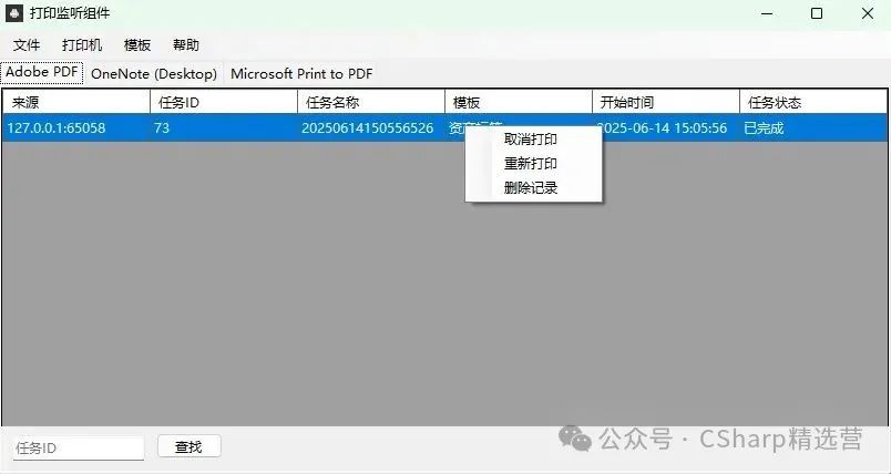 右键菜单:支持对单个任务进行“取消打印”、“重新打印”、“删除记录”等操作。