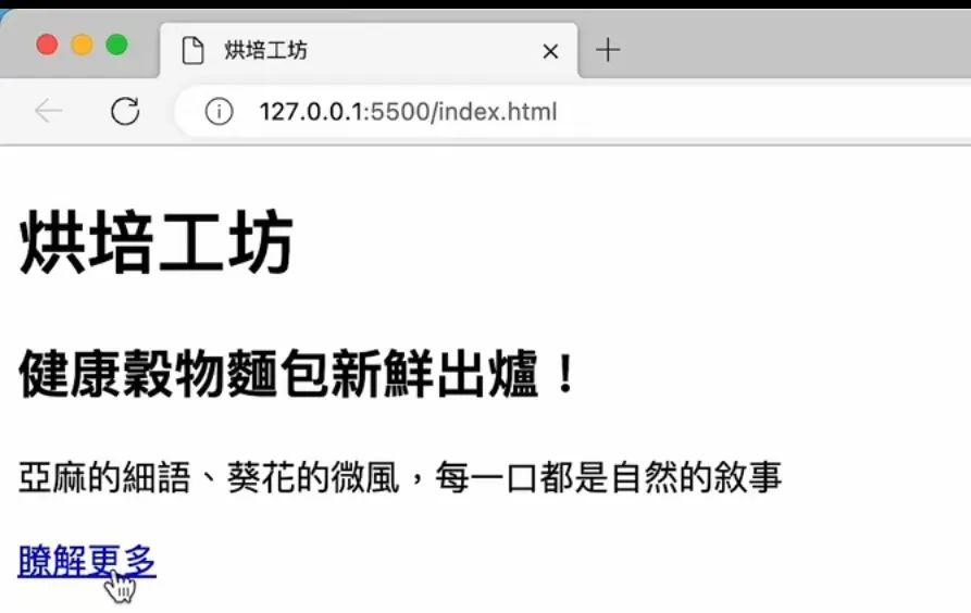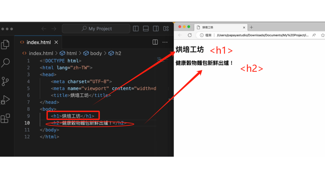 🔑 关键提示: 1. 数字越小字体越大 (h1最大) 2. 默认加粗+增加上下间距 3. 屏幕阅读器靠它们理解页面结构 同样,为了更直观地了解<h1>与<h2>之间不同的效果,在vscode中ctrl+s将文件储存后,在浏览器点击刷新网页就可看到你所写代码的最新效果。