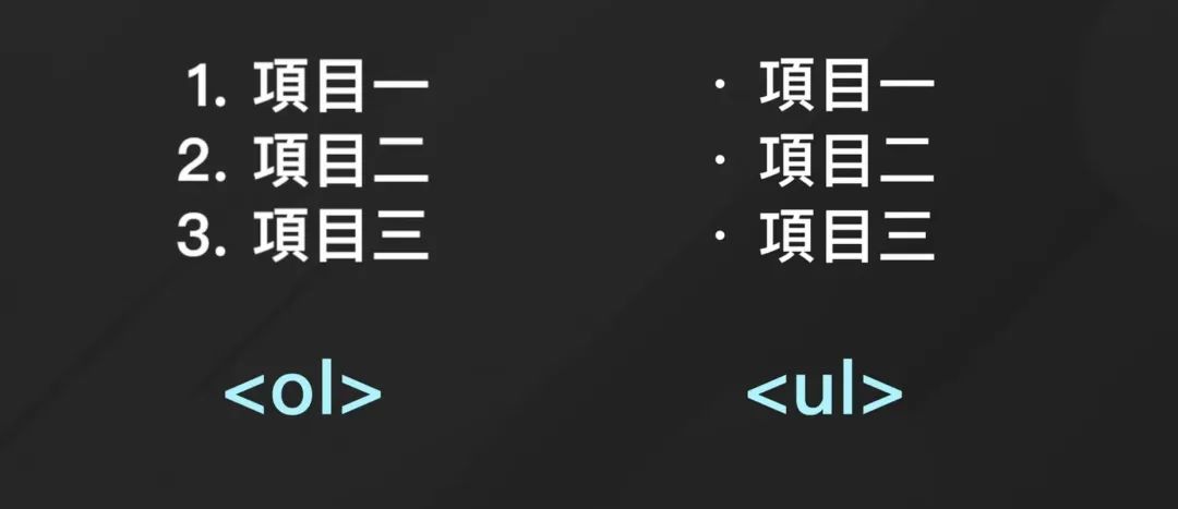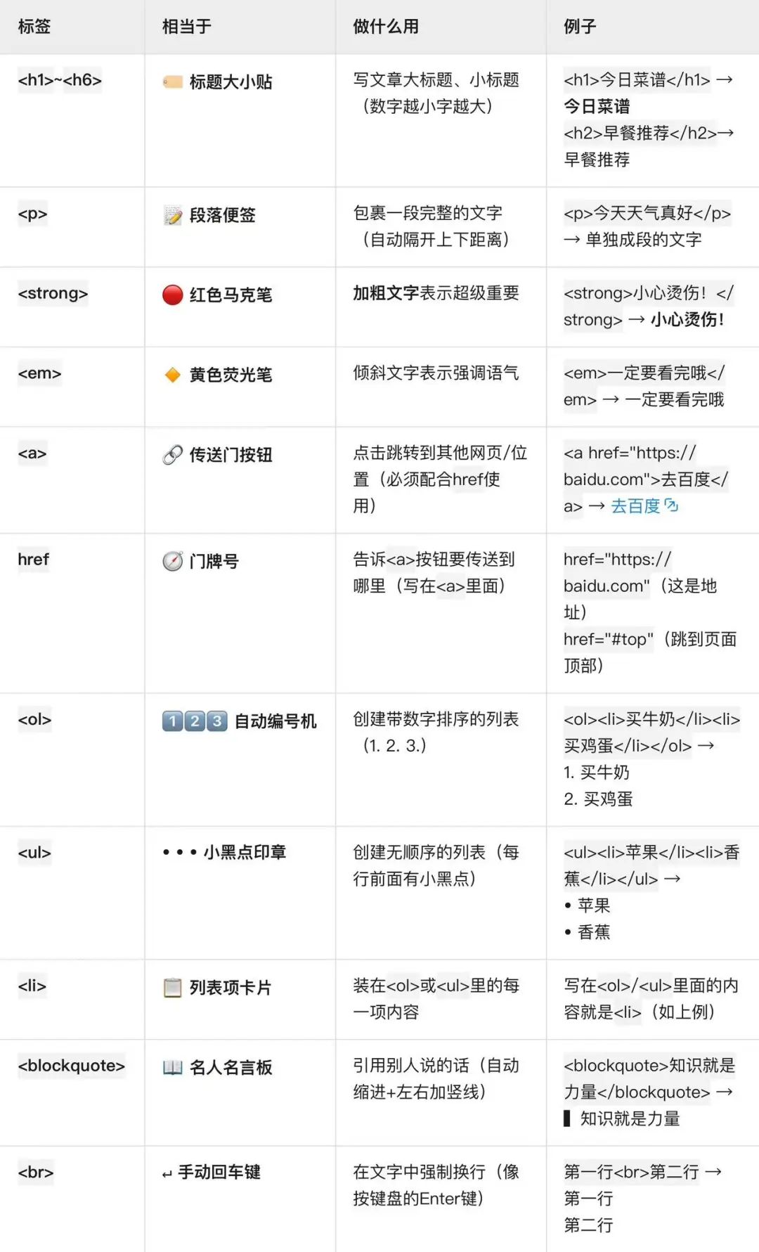 注:以上示例栏的文字为注释,实际写网页的过程,不必带上。 📋 五、清单标签 (List Tags) 在网页开发中,清单是实现结构化内容展示的核心组件,其作用远超简单的视觉排列。 1. 有序列表(带数字编号)<ol>(ordered list)标签