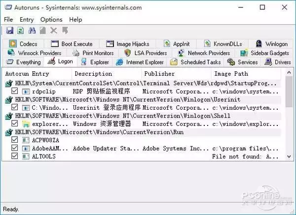 这时候出动的利器就是“Autoruns”,这个微软出品的小工具,它不仅有着msconfig里的启动项管理功能,还提供了诸如驱动、计划任务、映象劫持等等的各种可能让软件自行启动的纠察项目,绝对是对付自启动软件的利器。