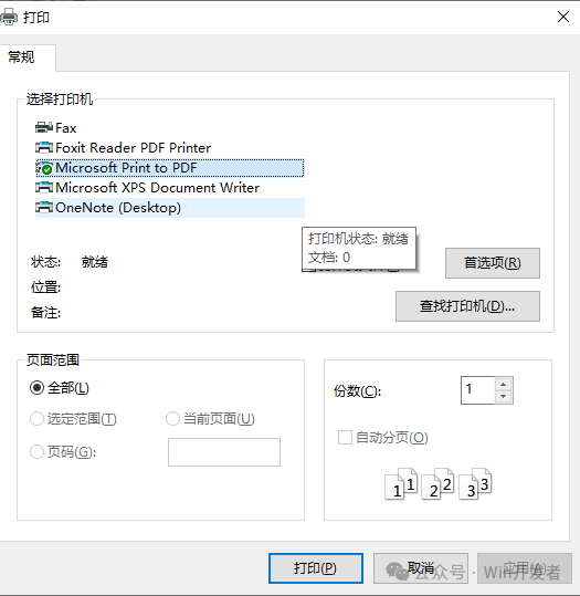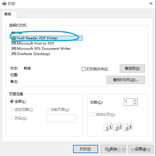 Foxit Reader PDF Printer 安装福昕阅读器后就会自动安装到打印机列表中,使用方式跟Microsoft Print To PDF一样
