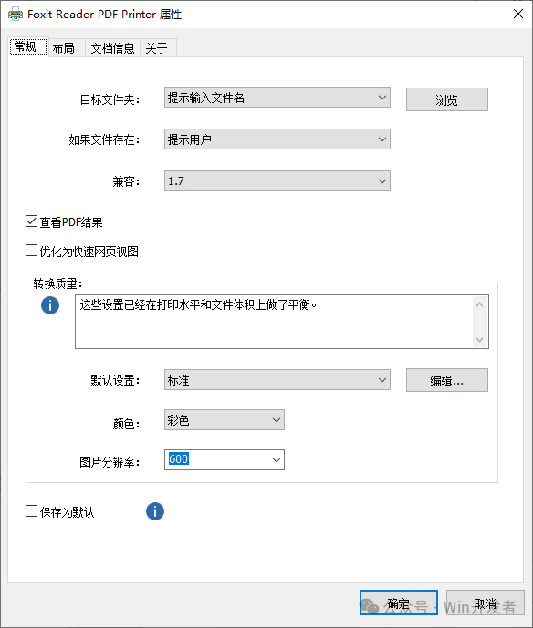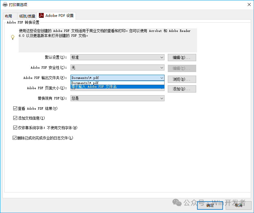 Adobe PDF 安装Adobe Acrobat会自动安装到打印机列表中,使用方法跟前面两个一样, Adobe Acrobat带的虚拟打印机可以指定文件输出路径,不用弹出选择文件夹对话框。 参数设置界面如下: