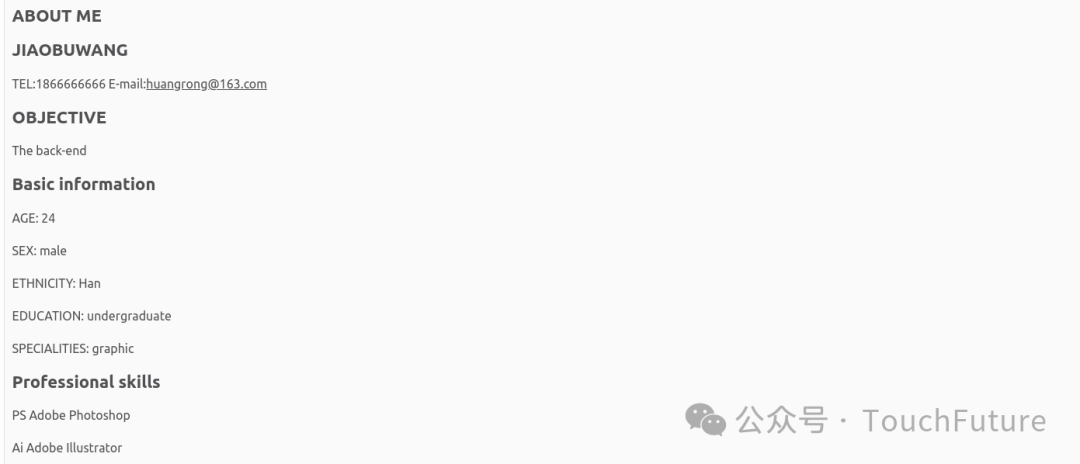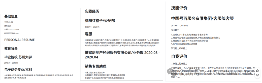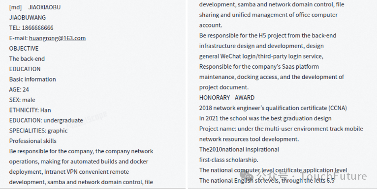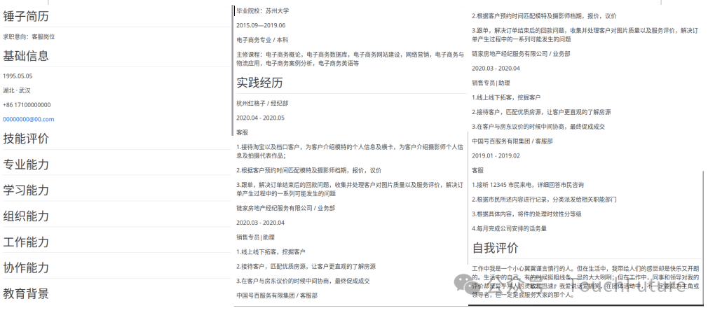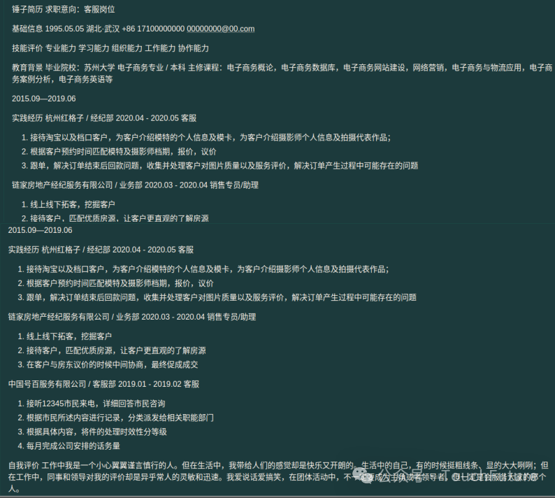 在下面的项目中我们使用下面的2份纯图片形式的求职简历作为输入,来测试OCR模型的识别和提取能力。