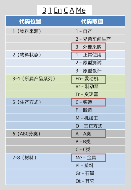 因为篇幅有限,我会捡一些重点来聊聊。 *** 对于物料编码问题,主要有四类,就是一物多码、一码多物、有物无码和有码无物。只要存在这四类问题的任何一类,给企业带来的主要危害,要么是库存积压,要么是生产缺料,还有就是会浪费大家的时间。 常用的物料编码方法,主要有三种,就是有意义编码法、半意义编码法和无意义编码法。 所谓有意义编码法,就是编码里面的每一位数字或者字母,都是有意义的,比如可以用这些数字或者字母,来代表物料的长度、宽度、高度、直径、重量、体积、材质、颜色、生产方式、图号、供应商等等。
