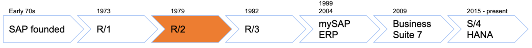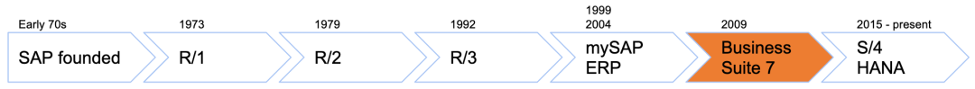 SAP产品的发展历史,大致分成以下六个发展阶段,并大概每十年一次大的迭代升级产品的过程。