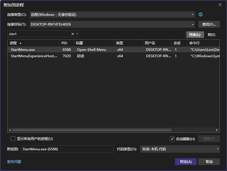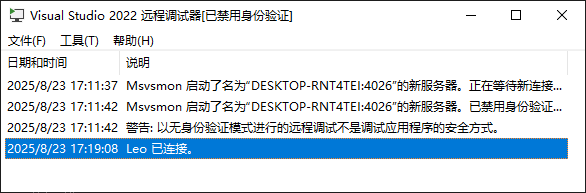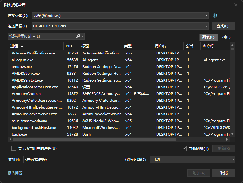 当你配置了部署目录,可在配置管理器里,将部署勾选上。 ![]() 之后即可启动调试。将会自动连接并调试测试机(或虚拟机)的程序。 连接成功后,测试机(或虚拟机) ![]() “ 方法二通过附加到进程的方式进行调试。 在开发机 VS ,菜单栏-调试-附加到进程,连接类型选“远程(Windows - 无身份验证)”,然后查找,顺利的话,将会显示对应的远程调试目标。 ![]() ![]() 连接成功后,再选择对应进程,附加到该进程上: ![]() 之后即可开始调试。 “ “ 该文章在 2025/9/23 12:58:38 编辑过 |