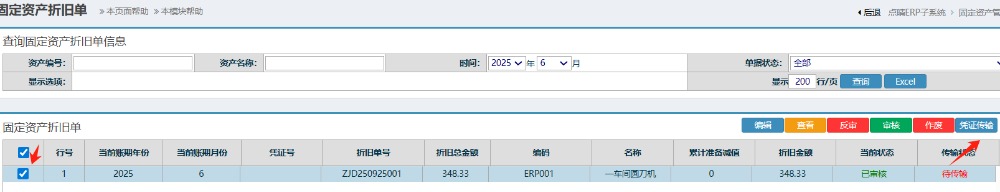 勾选上要转凭证的折旧单,然后再点击凭证传输按钮 如下图: