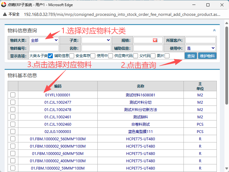 在弹窗物料信息界面内,按图操作:选择对应物料大类,点击查询。然后点击选择对应物料