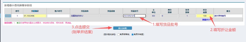 4.选好物料后,按图操作:填写货品批号以及折让金额,最后点击提交(制单并结案)