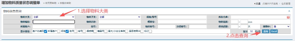 2.进入界面后,按图操作:先选择物料大类,然后点击查询。