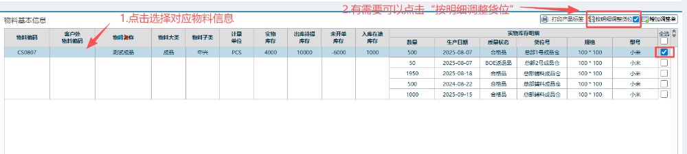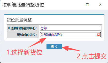 注:如果有需要调整库存位置:先点击对应物料信息,然后点击右边的“按明细调整货位”并在右边勾上对应物料。 在弹出的调整货位窗口内,选择新货位,然后点击提交。