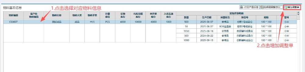 3.回到刚才的页面,新增调整单操作:点击对应物料信息,然后点击“增加调整单”
