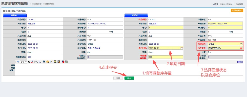 接着会跳转到新页面,按图操作:填写调整库存量以及日期,选择质量状态以及仓库位。最后点击提交。