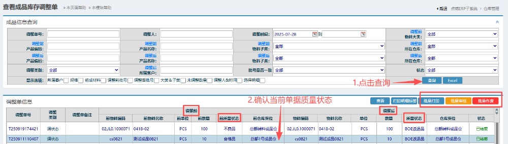 5.进入界面后,按图操作:先点击查询,确认当前调整单的质量状态。 注:有需要的话可以进行批量操作(审核、作废和打印)   点晴模切ERP更多信息:http://moqie.clicksun.cn,联系电话:4001861886 该文章在 2025/10/13 10:26:06 编辑过 | 关键字查询 相关文章 正在查询... |