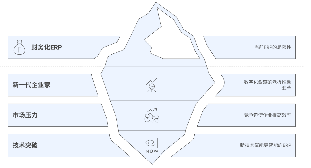 其他像生产制造、供应链协同、客户关系管理等业务模块,受重视程度和应用深度还是不够。 我把这种现象称之为“财务软件的路径依赖”。 那么为什么历经二十年的发展与迭代,国产ERP还是难以彻底摆脱“财务烙印”? 这背后其实是客户需求、厂商策略与实施环境三者相互交织、共同作用的结果,这篇内容我就从我个人的经验出发,尽可能跟大家聊明白,讲透彻。