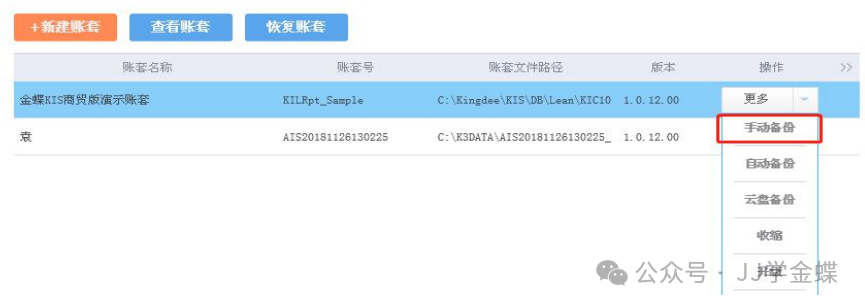 服务器电脑右下角任务栏双击打开【金蝶KIS专业版系统管理】-账套后面-更多-手动备份,如下图所示:
