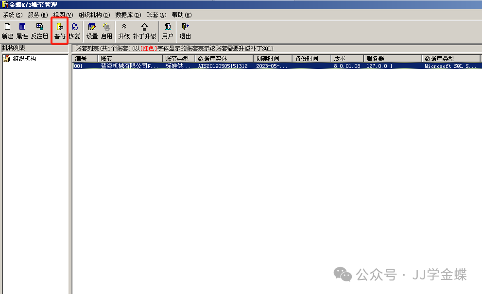 3、点中需要备份的账套,点工具栏【备份】