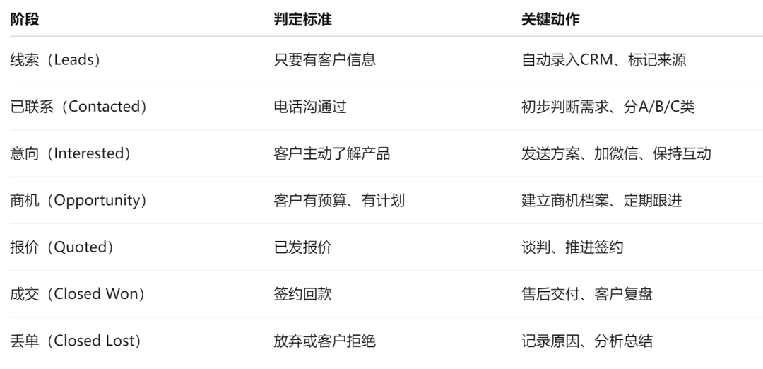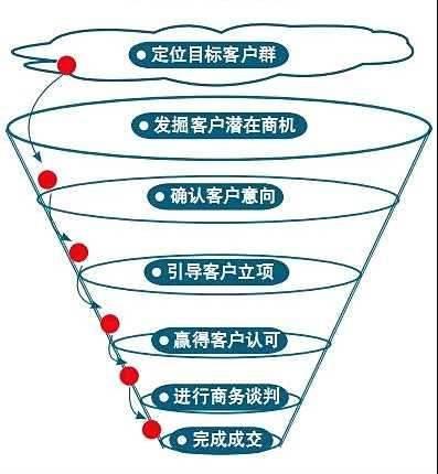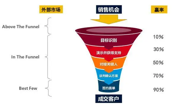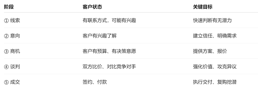 这就是“漏斗”的形状——越往下越少,漏斗的意义就在于: 让你知道客户掉在哪,掉多少,为什么掉。 如果你不看漏斗,所有客户都堆成一团,你根本分不清问题出在哪个环节。  02 漏斗的底层逻辑:销售是过程管理 很多人把销售当成“个人能力游戏”——谁嘴皮子厉害,谁人脉多,谁关系广,但优秀的企业早就明白一个道理: 销售不是玄学,是可管理的过程。 销售漏斗就是把“成单的过程”拆成一个个可以量化、可以优化的阶段。我们可以把销售看成五个阶段:  每个阶段都对应不同的动作和策略。如果你不分阶段,只知道“客户很多”,那根本不知道该怎么推进。 而销售漏斗,就是让你把客户分层管理,知道:
