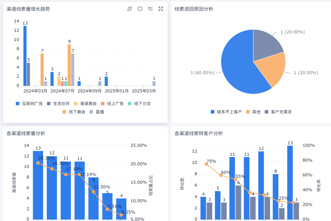 只有分清楚,你的团队资源、时间和精力才能放在刀刃上。  03 为什么线索多但成交少? 举几个典型的“漏斗病”。 情况1:上宽中断 → 跟进不力  看起来前期客户挺多,但掉得太快。说明销售团队在“意向转商机”阶段掉链子。 原因通常有三个: