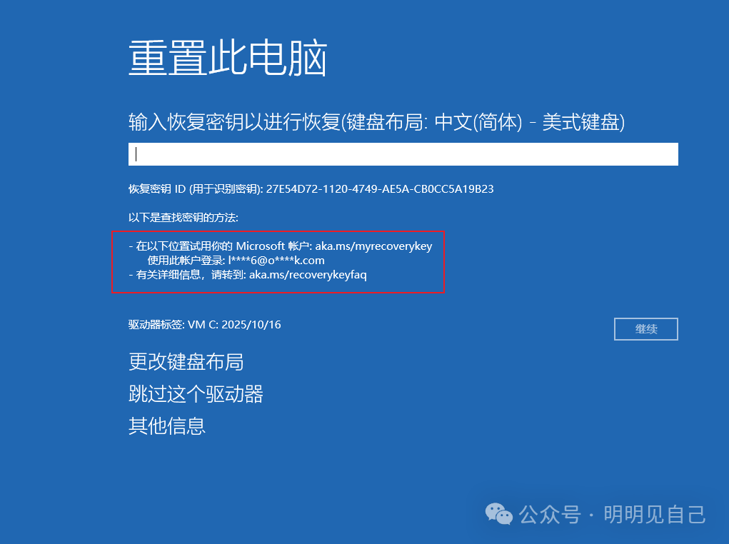 别担心 “加密会拖慢电脑”—— 现在的 BitLocker 对性能影响很小,日常办公、追剧基本感觉不到,反而丢电脑时能防别人偷数据,算个 “隐形保护罩”。 二、遇到锁别慌:先解决 “紧急问题”看到锁后,最常遇到两个需求:要么想重置系统,要么想读 C 盘数据,这时候都要用到「恢复密钥」,具体怎么找、怎么用,一步一步来: 📌 需求 1:重置系统时提示 “要 BitLocker 密钥”很多人遇到 “系统崩溃,想重置电脑”,走到一半卡在这里: