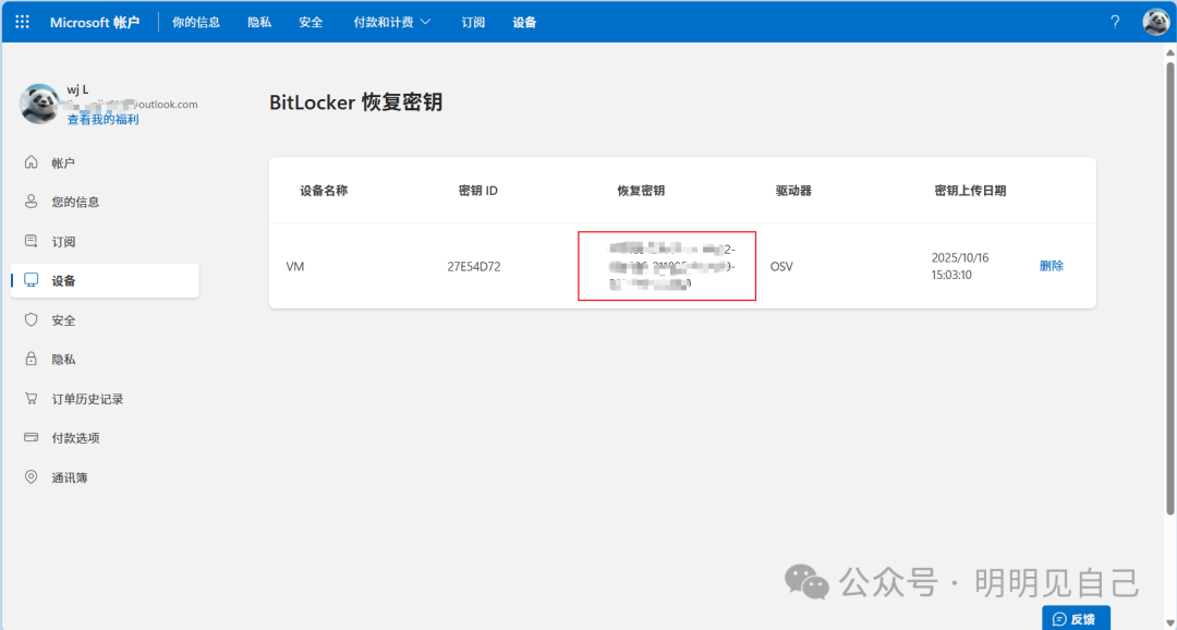 打开浏览器,访问「aka.ms/myrecoverykey」,登录你电脑绑定的微软账号(就是开机时用的那个邮箱 / 手机号),里面会直接显示 “BitLocker 恢复密钥”(一串 24 位数字);