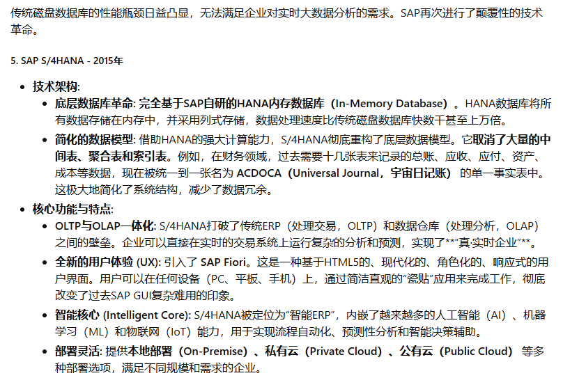 SAP(Systeme, Anwendungen und Produkte in der Datenverarbeitung,即“数据处理中的系统、应用和产品”)公司于1972年在德国魏恩海姆(Weinheim)成立。其创始人是五位前IBM公司的工程师:Dietmar Hopp, Hans-Werner Hector, Hasso Plattner, Klaus Tschira, 和 Claus Wellenreuther。他们的核心理念在当时是革命性的:开发能够实时处理业务数据的标准化商业软件。在那个年代,数据处理通常是批处理模式(Batch Processing),即数据被收集起来,在夜间或非高峰时段统一处理,管理者第二天才能看到报表。SAP的“实时(Real-time)”理念,旨在让企业在数据产生的那一刻就能进行处理和分析,为管理决策提供即时支持。这个初心贯穿了SAP产品演进的始终。SAP的ERP产品历程,是全球企业信息化发展的缩影,大致可以分为以下几个关键时代: 第一阶段:大型机时代 - 奠定基础 (1970s - 1980s) 第二阶段:客户端/服务器时代 - 称霸全球 (1990s) 第三阶段:互联网与平台化时代 - 延伸与整合 (2000s - 2010s) 第四阶段:内存计算与云时代 - 智能与简化 (2015年 - 至今)希望这份详尽的解读能够帮助您全面了解SAP ERP产品波澜壮阔的发展历程。